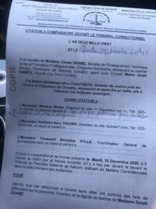 Accusée d’avoir indûment subtilisé 200 milliards de nos francs, madame le ministre de l’Enseignement Technique et de la Formation professionnelle s’en prend désormais à nos confrères qui ont relayés cette information. A travers une citation à comparaître  émise par le Tribunal correctionnel de Dixinn en date de ce vendredi, 4 décembre 2020, il est demandé  à nos confrères Moussa Moïse Sylla, directeur du site Inquisiteur.net ; Ibrahima Sory Traoré, directeur du site Guinée7.com ; Youssouf Boundou Sylla, coordinateur général du site Guineenews.org, de se présenter le mardi, 15 décembre prochain devant ladite juridiction. Ainsi en a décidé dame Zeïnab Dramé qui les poursuit pour des faits de « diffamation, l’honneur et la dignité de sa personne ».
