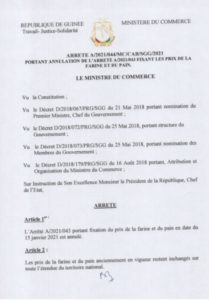 Le ministre du Commerce Boubacar Barry a pris une nouvelle décision annulant celle qu’il a préalablement prise et qui annonçait la hausse du prix de la baguette de pain et de la farine. Dans ledit communiqué dont Laguinee.info détient copie, il est mentionné que les prix de la baguette de pain et de la farine restent inchangés.