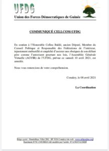 Dans un communiqué en date de ce jeudi, 8 avril 2021et dont Laguinee.info a reçu copie, l’UFDG à travers sa cellule de communication, annonce l’annulation de son Assemblée Générale Virtuelle de ce samedi, 10 avril 2021. A travers cette décision, la principale formation politique de l’opposition apporte ainsi « son soutien à l’Honorable Cellou Baldé, ancien Député, Membre du Conseil Politique et Responsable des Fédérations de l’intérieur, injustement embastillé et empêché d’assister aux obsèques de son défunt père comme l’autorisent pourtant nos lois », explique la cellule de communication de l’UFDG.