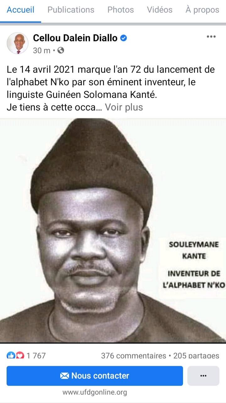 Ce 14 avril 2021, marque l’an 72 de la création de l’alphabet N’Ko. Fervent défenseur de nos langues nationales, le président de l’UFDG à travers sa page Facebook, vient de rendre hommage à Solomana Kanté, inventeur du N’Ko.