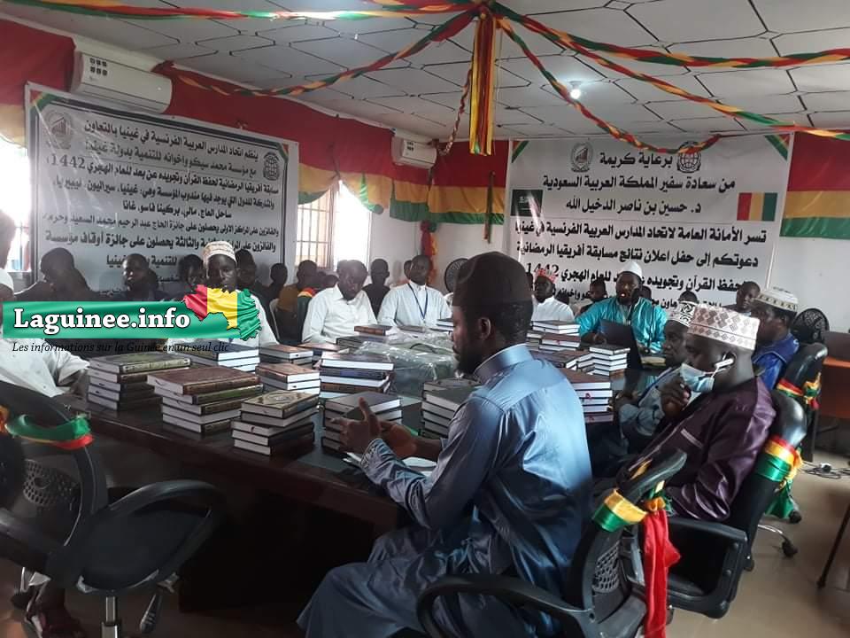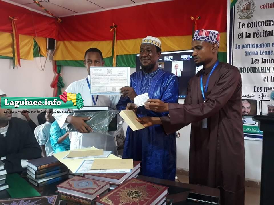 Les résultats de la 2ème édition du concours Ramadanesque de l’Afrique pour la mémorisation et la récitation du Saint Coran à distance ont été proclamés ce samedi, 1er mai 2021 lors d’une cérémonie officielle organisée à Dubreka. Ce concours de mémorisation et de récitation du Saint Coran a été organisé par l’Union des Écoles Arabo-Françaises de Guinée, en collaboration avec l’Institut Mohamed Sékou et Frères pour le progrès en Guinée. Au total, 74 personnes issues de 8 pays d’Afrique (la Guinée, la Sierra Leone, le Libéria, la Côte d’Ivoire, le Mali, le Burkina-Faso, Congo Brazzaville et le Ghana) ont participé à ce concours. Et, des résultats proclamés par les membres du jury basés à l’étranger, c’est le Guinéen Abdoul Hady Bah élève en classe de 12ème année sciences mathématiques qui a été classé lauréat de ce concours. Il a raflé un chèque de cinq millions de francs guinéens, un Coran, une attestation et plusieurs autres cadeaux a constaté sur place Laguinee.info à travers un de ses journalistes.