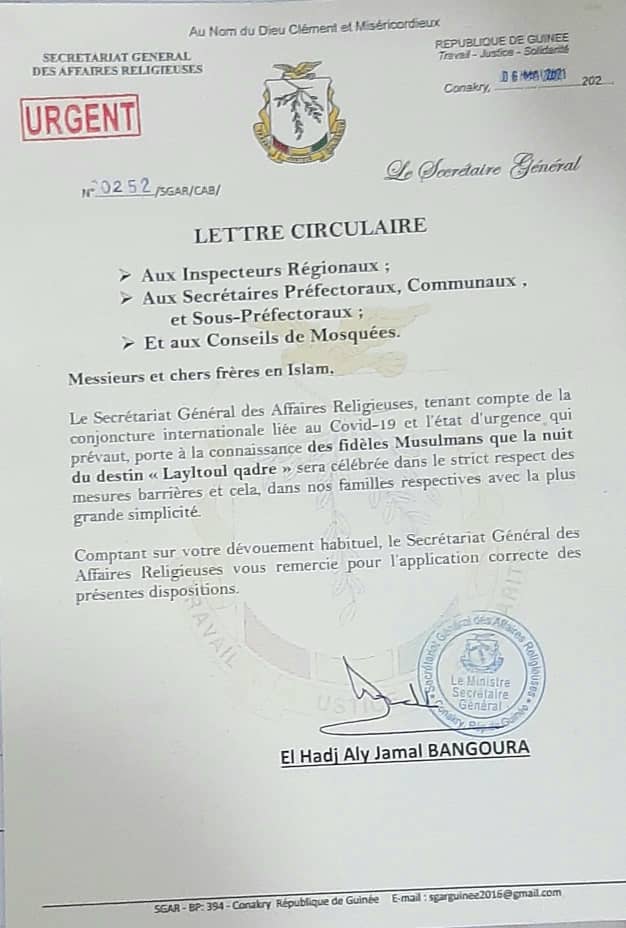 Dans une note circulaire en date du jeudi, 6 mai 2021, et dont Laguinee.info détient copie, le Secrétaire Général des Affaires Religieuses, Elhadj Aly Jamal Bangoura invite les fidèles musulmans de Guinée à célébrer la nuit du destin ou « Layltoul qadre » dans le strict respect des mesures barrières. Et cela, « dans nos familles respectives avec la plus grande simplicité ». Le ministre secrétaire général des Affaires Religieuses motive sa décision par « la conjoncture internationale liée au Covid-19 et l’état d’urgence qui prévaut dans notre pays ».