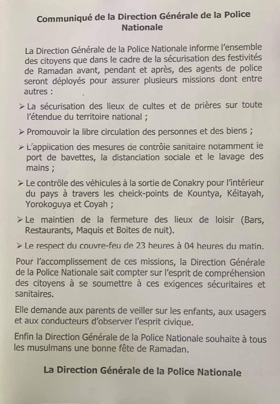 A l’instar de ses coreligionnaires, les fidèles musulmans de Guinée vont célébrer demain jeudi, 13 mai 2021, la fête marquant la fin du mois de Ramadan ou l’Aid el-Fitr. En prélude à la célébration de cette importante fête musulmane, la direction générale de la police nationale a dans un communiqué dont Laguinee.info a reçu copie, annonce le renforcement des mesures de contrôle sanitaire. Aussi, la police annonce le contrôle des véhicules à la sortie de Conakry vers l’intérieur du pays à travers des cheick-point de Kountia, Keïtayah, Yorokoguiya et Coyah.