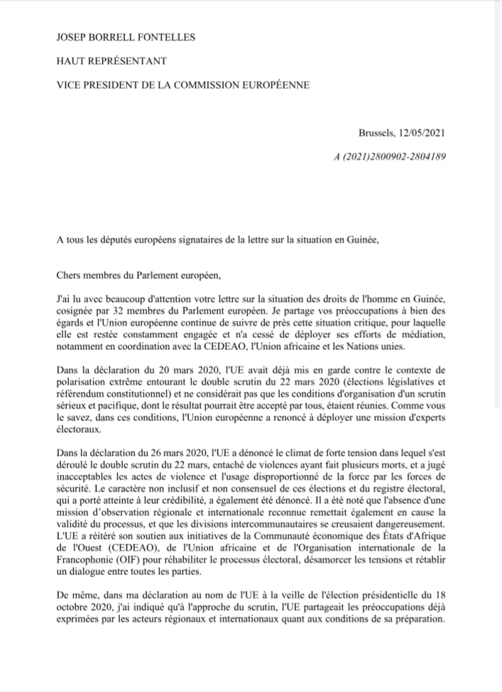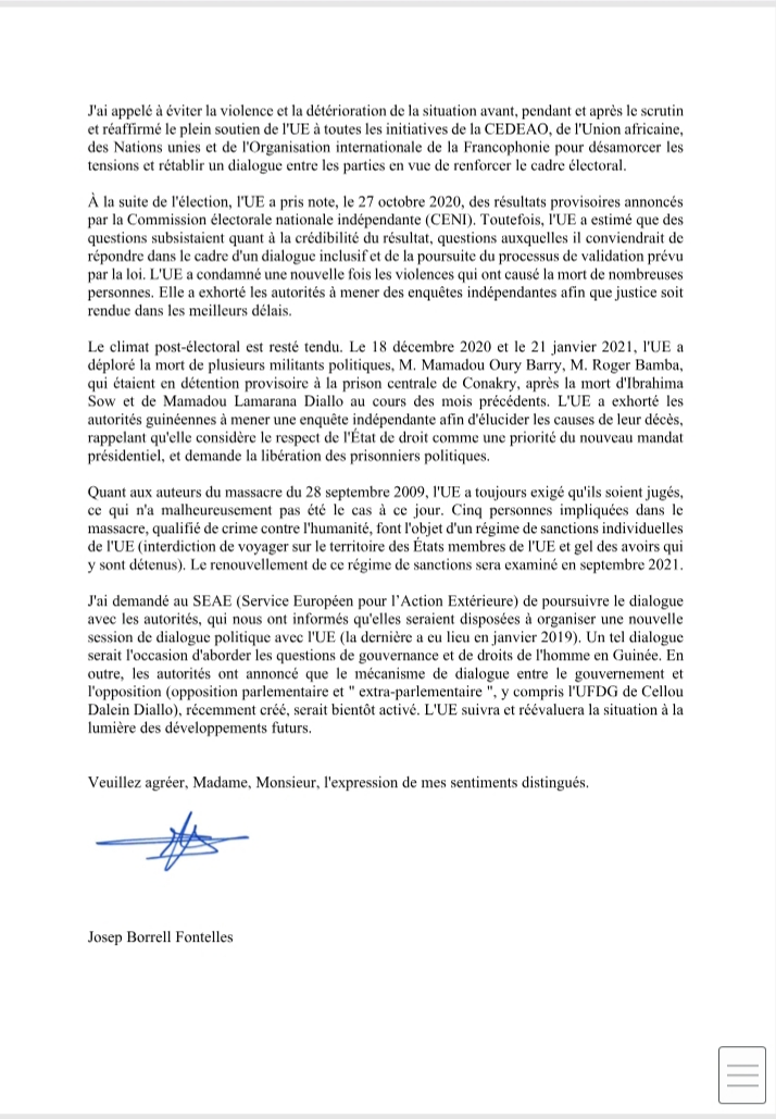 Le vice-président de la commission de l’Union Européenne (UE) vient de répondre au courrier des 32 députés de l’organisation. Un courrier comportant des dénonciations sur la détérioration des droits de l’Homme en Guinée. Joseph Borrell Fontelles écrit qu’il partage leurs préoccupations. Dans plusieurs paragraphes de sa lettre-réponse, des efforts fournis par l’UE pour tenter d’inverser la donne dans le pays sont énumérés. Une manière de rassurer les élus du vieux continent que la situation en Guinée le préoccupe autant qu’eux. Plus loin, il est mentionné que cinq des personnes impliquées dans les massacres du 28 septembre 2009 dans un stade de Conakry, sont interdites de voyages sur le territoire européen et leurs avoirs gelés. Mais aucun nom n’est révélé, a appris Laguinee.info à travers un de ses reporters.