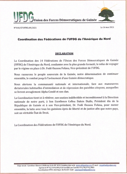 Laguinee.info vous propose cette déclaration de soutien de la coordination des fédérations UFDG de l’Amérique du Nord