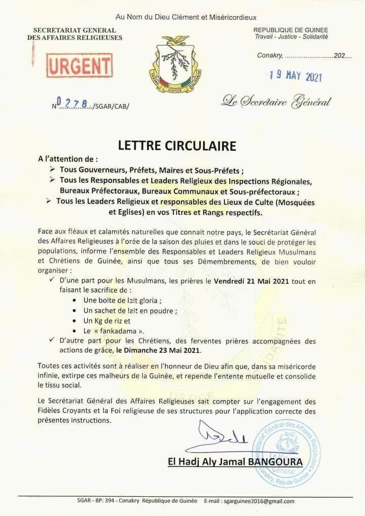 Dans une note circulaire en date du mercredi, 19 mai 2021 et dont Laguinee.info a reçu copie, le secrétariat général des Affaires Religieuses invite les religieux (musulmans et chrétiens) à organiser des sacrifices. Dans cette note circulaire adressée aux gouverneurs, préfets, sous-préfets et tous les leaders religieux et responsables des lieux de culte, le département en charge des Affaires Religieuses demande qu’il soit organisé à l’orée de cette saison hivernale pour les musulmans : les prières le vendredi prochain et faire le sacrifice de « boîte de gloria ; un sachet de lait en poudre ; un kilogramme de riz et le fankadama ». Et chrétiens, le secrétariat des Affaires Religieuses leur demande également de prier le dimanche, tout en procédant à des actions de grâce.