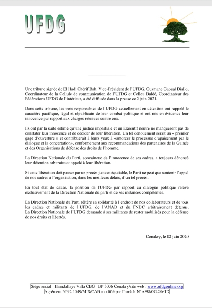 C’est une sorte de précision que la Direction nationale de l’UFDG vient de faire. D’après elle, toute participation à un dialogue avec le régime en place « relève exclusivement », d’elle et de « ses instances compétentes ». Une réplique faite, sans doute, à la tribune parue dans la presse plutôt dans la journée. Dans ladite tribune, il est indiqué que Cellou Baldé, Gaoual et Cherif Bah, tous en détention à la maison centrale de Conakry depuis 8 mois, et membres du bureau exécutif de l’UFDG, sont favorables à l’ouverture d’un dialogue entre pouvoir et opposition sur la crise politique actuelle du pays. Mais à propos, leur parti politique reste catégorique. Il l’a réitéré dans un communiqué dont une copie est parvenue à Laguinee.info dans la nuit de ce mercredi, 2 juin 2021.