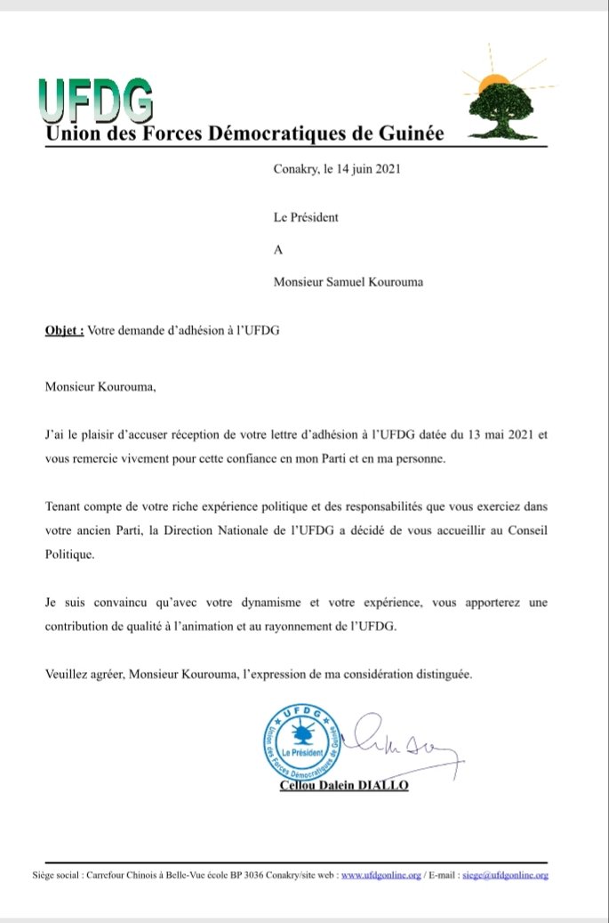 Laguinee.info vous propose ci-dessous la demande d’adhésion de Samuel Kourouma et la réponse de la Direction nationale de l’UFDG