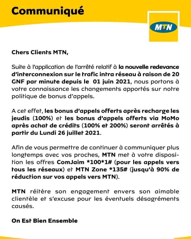 Dans un communiqué publié ce samedi et dont Laguinee.info détient copie, MTN Guinée informe que les bonus d’appels offerts après recharge et ceux offerts via Mobile money après achat seront arrêtés à partir du lundi, 26 juillet 2021.