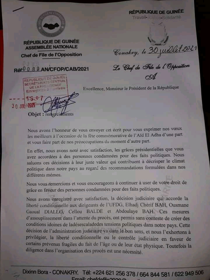 Le chef de file de l’opposition guinéenne a écrit au chef de l’Etat, Alpha Condé. La lettre dont Laguinee.info détient copie, contient des remerciements à ce dernier pour les remises de peine récemment accordées à quelques détenus politiques. Par la même lettre, Mamadou Sylla encourage la justice du pays à privilégier la « liberté conditionnelle » ou « le contrôle judiciaire » en faveur des « prévenus fragiles du fait de l’âge ».