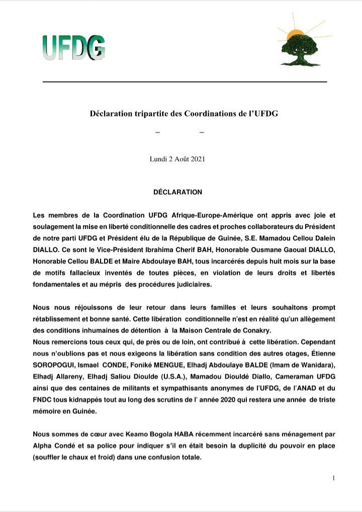 Dans une déclaration tripartite rendue publique ce lundi, 02 août 2021 et dont Laguinee.info détient copie, les coordinations de l’UFDG Afrique, Europe et Amérique se réjouissent de la mise en liberté conditionnelle de Chérif Bah, Ousmane Gaoual Diallo, Abdoulaye Bah et Cellou Baldé, tous des hauts cadres du parti. Elles exigent tout de même la libération des autres détenus, notamment Étienne Soropogui, Ismaël Condé, Foniké Mengué, Keamou Bogola Haba, entre autres.