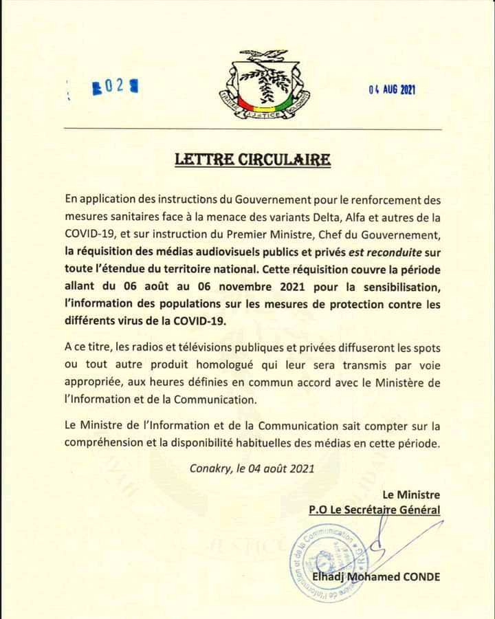 Dans une lettre circulaire rendue publique ce jeudi, 05 août 2021 et dont Laguinee.info détient copie, le Ministère de l’Information et de la Communication a reconduit pour une période de trois mois allant du 06 août au 06 novembre 2021, la réquisition des médias audiovisuels publics et privés.