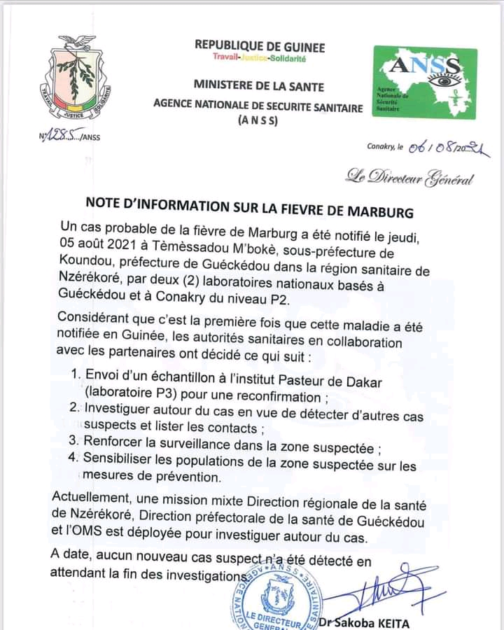 Dans une note d’information rendue publique ce vendredi, 06 août 2021 dont Laguinee.info détient copie, l’Agence Nationale de Sécurité Sanitaire (ANSS) dit avoir pris des dispositions concernant un cas probable de la fièvre Marburg qui aurait été découvert ces derniers jours dans la préfecture de Guéckédou. Mais, en attendant les résultats des tests dans les laboratoires, l’ANSS dit avoir pris déjà des dispositions.