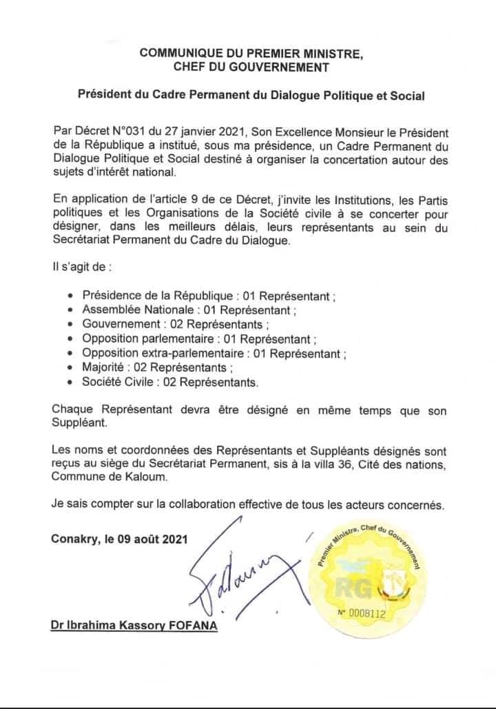 Dans un communiqué rendu public ce lundi, 09 août 2021 dont Laguinee.info détient copie, le Premier ministre guinéen en sa qualité du président du cadre permanent du dialogue politique et social a invité toutes les parties prenantes à désigner leurs représentants.