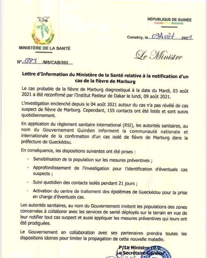 Dans ce même communiqué dont Laguinee.info détient copie, le ministre de la Santé indique que le cas du virus Marbourg a été reconfirmé par l’Institut Pasteur de Dakar. A ce jour, 155 contacts ont été enregistrés et suivis régulièrement précise le communiqué.