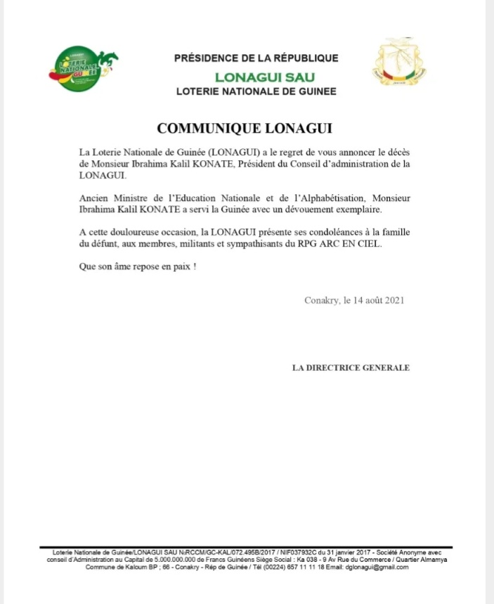 Comme annoncé précédemment sur Laguinee.info, Ibrahima Kalil Konaté ancien ministre de l’Education Nationale et de l’Alphabétisation (MENA) est décédé ce samedi, 14 août 2021, des suites de Coronavirus. Dans un communiqué rendu public ce soir et dont Laguinee.info détient copie, la direction générale de la Loterie Nationale de Guinée (LONAGUI) a présenté ses condoléances à la famille du défunt, aux membres, militants et sympathisants du RPG arc-en-ciel.