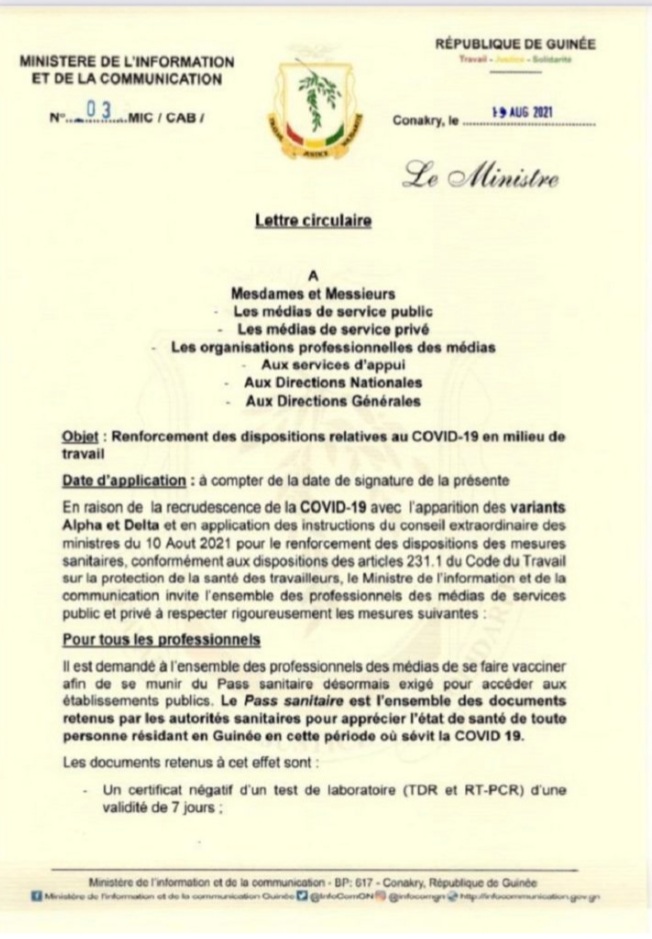 Dans une lettre circulaire en date du 19 août 2021 signée du ministre Amara Somparé dont Laguinee.info détient copie, le Département de l’Information et de la Communication a invité l’ensemble des professionnels des médias publics et privés à renforcer les mesures sanitaires dans les services. Ce, à cause de la présence des variants Alpha et Delta. Parmi ces mesures, l’exigence du pass sanitaire pour accéder dans les lieux de travail.