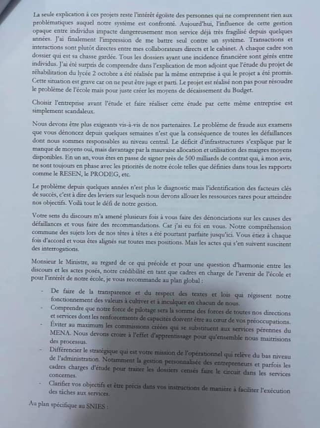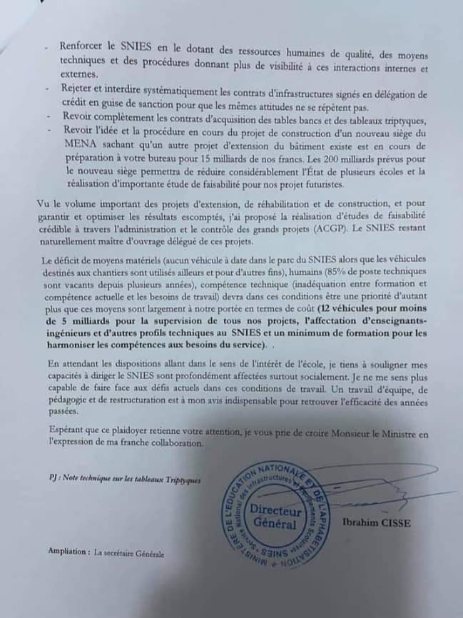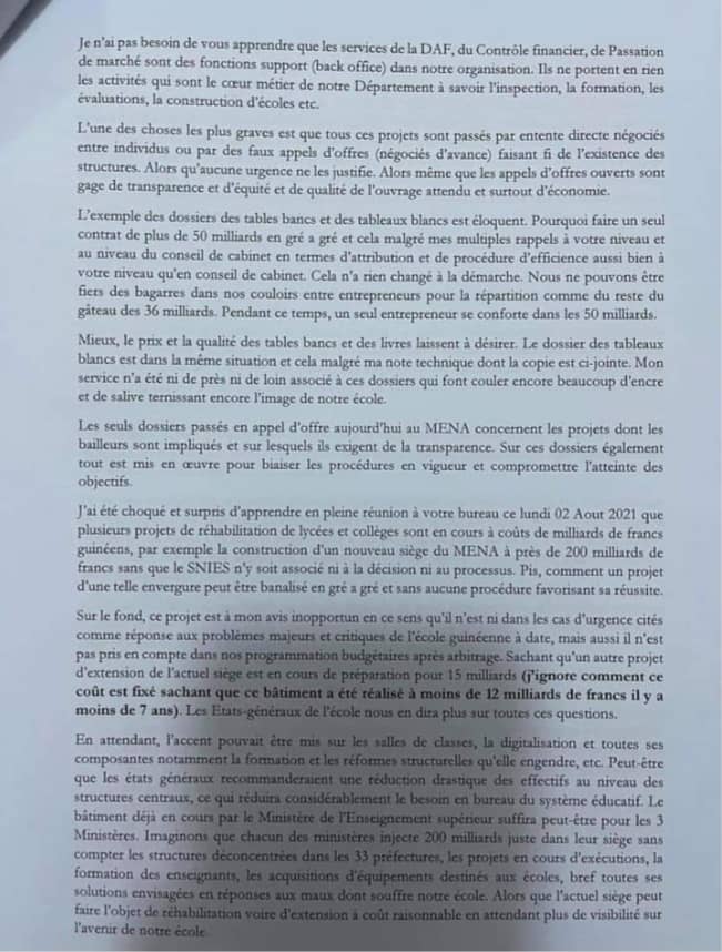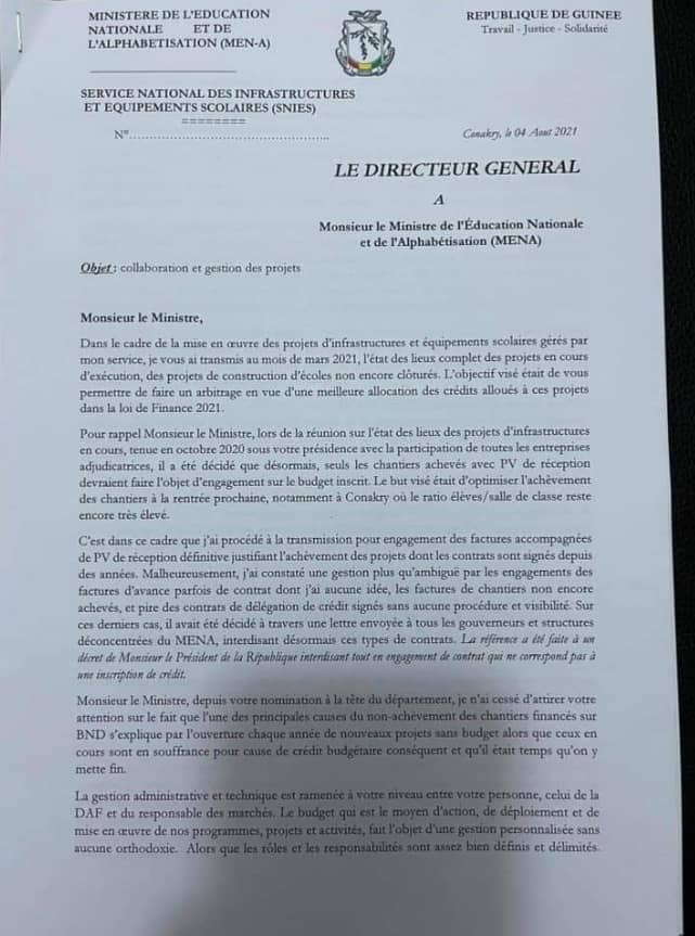 Laguinee.info vous propose ci-dessous copie de cette lettre directeur général du service des infrastructures et équipements scolaires adressée à son patron