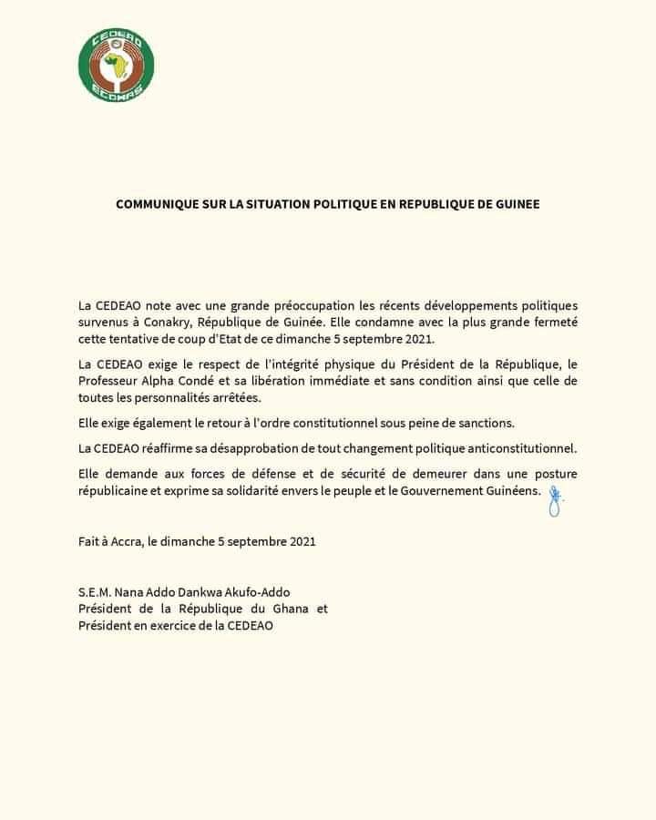 Dans un communiqué en date de ce dimanche, 05 septembre 2021 dont Laguinee.info détient copie, « la CEDEAO condamne avec la plus grande fermeté cette tentative de coup d’Etat ». Elle exige également le retour à l’ordre constitutionnel sous peine de sanctions. La CEDEAO demande aussi aux forces de défense et de sécurité de demeurer dans une posture républicaine et exprime sa solidarité envers le peuple et le gouvernement guinéens.