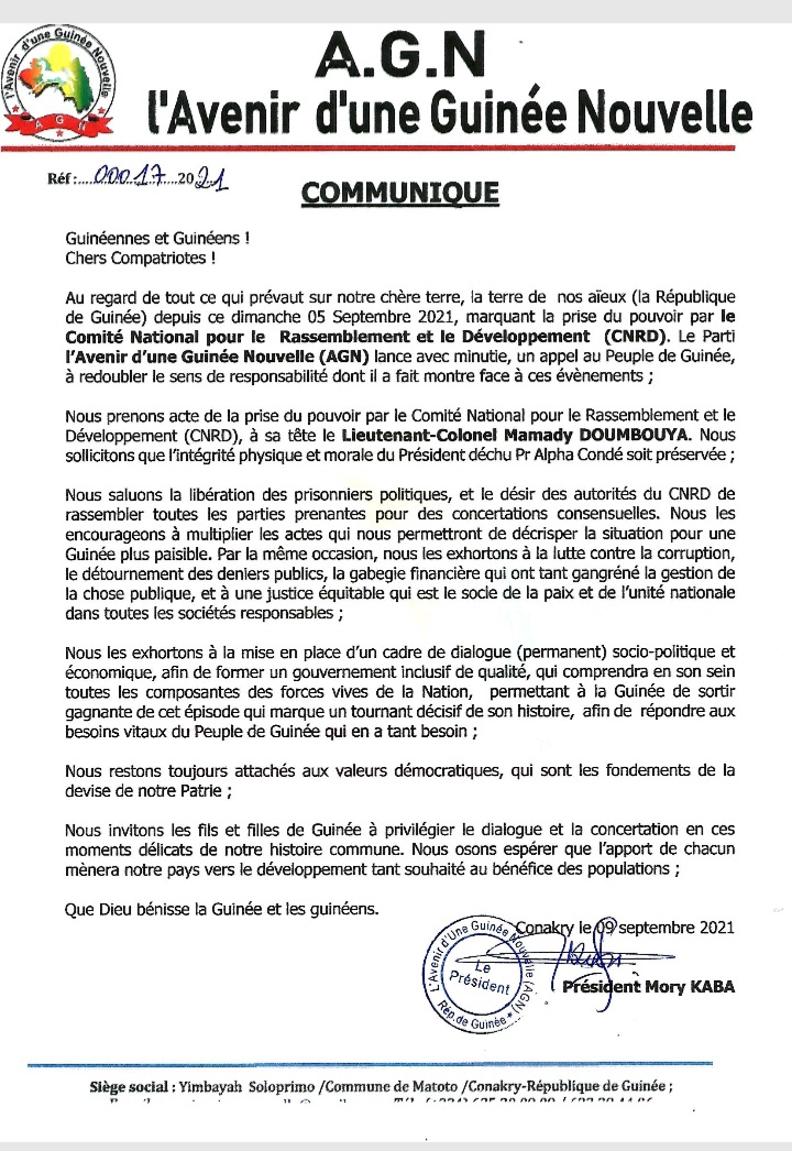 Dans une déclaration rendue publique ce mercredi 08 septembre 2021 dont Laguinee.info détient copie, le parti de l’Avenir d’une Guinée Nouvelle (AGN) dit prendre acte de la prise du pouvoir par le Comité National pour le Rassemblement et le Développement (CNRD) le 05 septembre dernier. L’AGN exhorte les nouvelles autorités à préserver l’intégrité physique et morale du président déchu, professeur Alpha Condé.