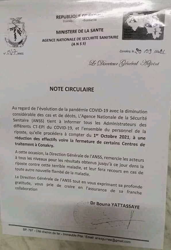C’est à travers une note circulaire en date d’hier lundi, 20 septembre 2021 que l’Agence Nationale de Sécurité Sanitaire (ANSS) a informé tous les administrateurs des CT-Epi de la réduction voire la fermeture de certains centres de traitement à Conakry à compter du 1er octobre 2021. Ce, en raison de l’évolution de la pandémie du Covid-19 avec la diminution considérable des cas de contamination et des décès.