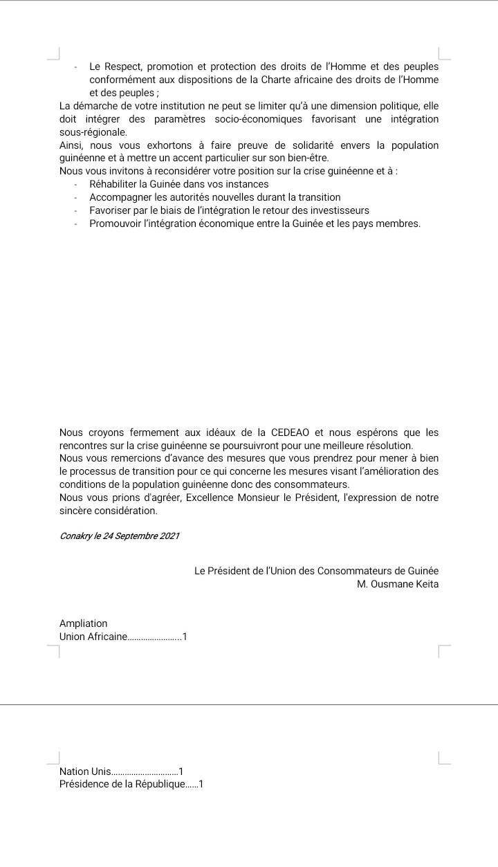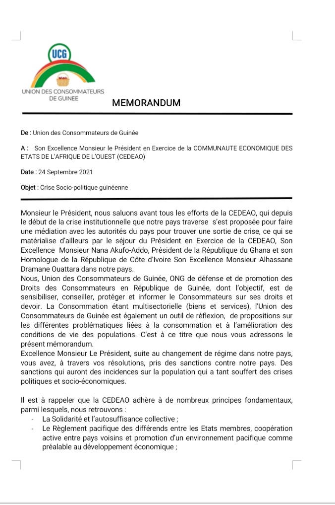 A travers une lettre en date du 24 septembre dernier dont une copie est parvenue à la rédaction de Laguinee.info, l’Union des Consommateurs de Guinée (UCG) a fait savoir à la CEDEAO que ses sanctions auront des incidences sur les conditions de vie des populations guinéennes qui ont tant souffert des crises politiques et socio-économiques.