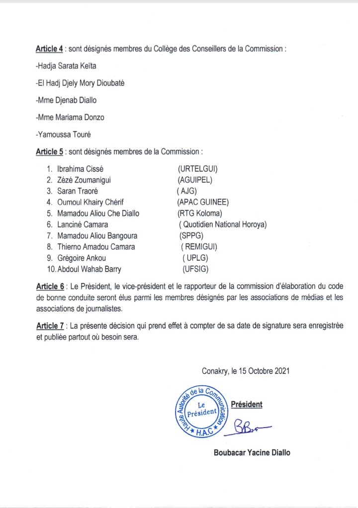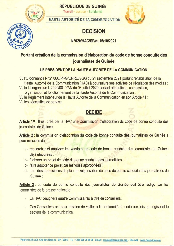 Laguinee.info vous propose ci-dessous cette décision de la HAC sur la mise en place commission d’élaboration du code de bonne conduite des journalistes