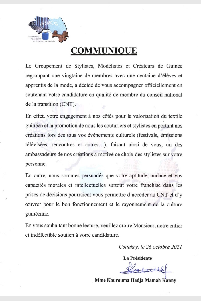 Les derniers cas date d’hier, mardi 26 octobre 2021 où Mamadou Thug a bénéficié des soutiens du Groupement des Stylistes, Modélistes et Créateurs de Guinée (GSMCG), regroupant une vingtaine de membres avec une centaine d’élèves apprentis et de l’Association des Troupes Artistiques de Guinée (ATAG). A travers des communiqués dont Laguinee.info détient copies, ces deux organisations culturelles disent être persuadées que les capacités morales et intellectuelles de l’humoriste lui permettront d’œuvrer pour le bon fonctionnement et le rayonnement de la culture guinéenne.