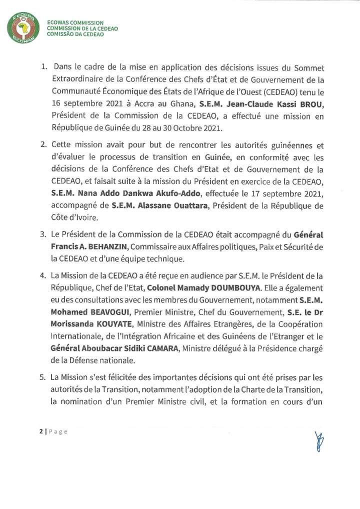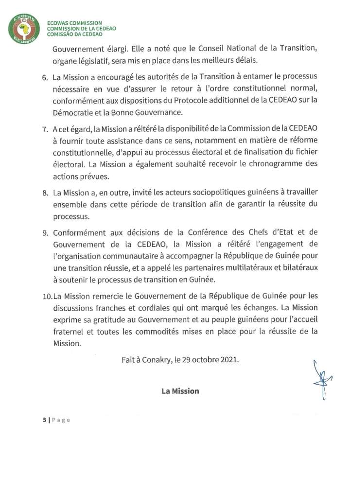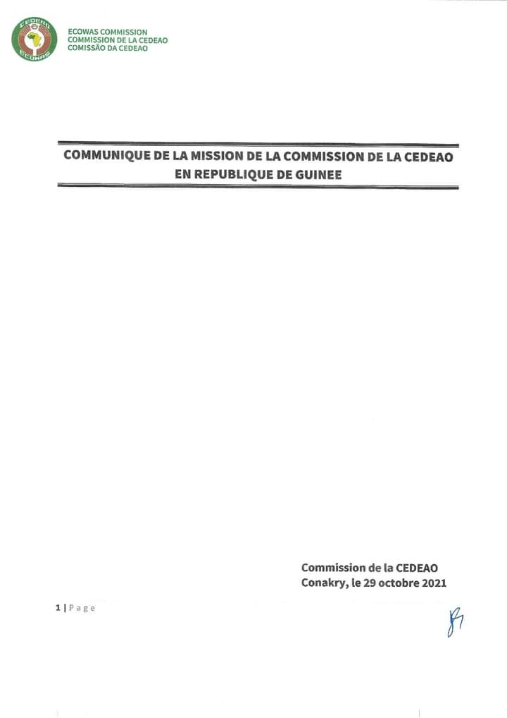 La Communauté Economique des États de l’Afrique de L’Ouest (CEDEAO) a déployé une délégation en Guinée conduite par le président de la commission de l’organisation. Au terme de deux jours de travail, cette mission a livré un communiqué final de son constat par rapport à la transition en Guinée.