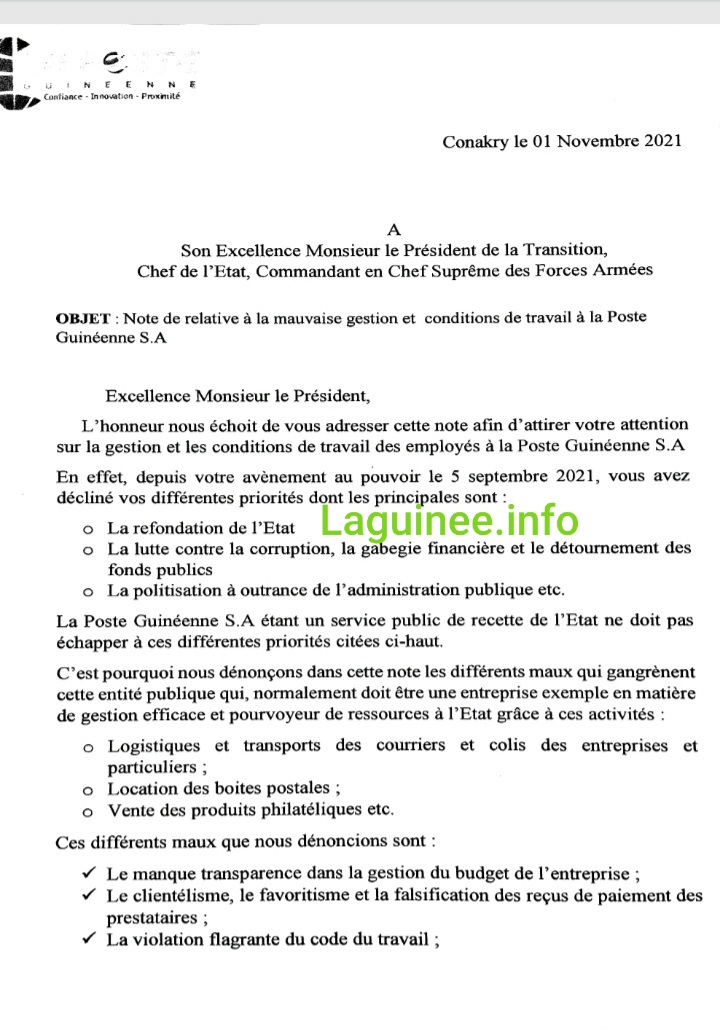 Dans une lettre en date d’hier lundi, 1er novembre 2021 dont Laguinee.info détient copie, les travailleurs de La Poste Guinéenne (S.A) ont attiré l’attention du président de la transition sur « la mauvaise gestion et les conditions de travail » des travailleurs de ce service public de recette de l’Etat guinéen. Parmi les maux dénoncés par les travailleurs, figurent le manque de transparence dans la gestion du budget; le clientélisme, le favoritisme et la falsification des reçus de paiement des prestataires; la violation flagrante du code du travail ; entre autres.