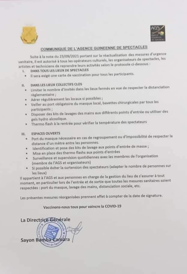 Dans un communiqué en date d’hier mardi 02 novembre 2021, l’Agence Guinéenne des Spectacles (AGS) a autorisé la réouverture de toutes les activités culturelles en Guinée. Selon le même communiqué, cette réouverture est soumise au respect de certaines mesures sanitaires dont l’exigence de la carte de vaccination, le port des masques, entre autres.