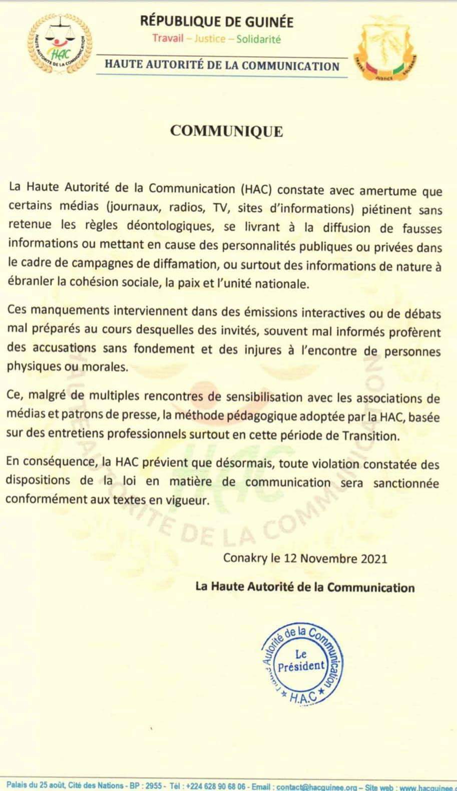 A travers un communiqué en date de ce vendredi 12 novembre 2021 dont Laguinee.info détient copie, la Haute Autorité de la Communication (HAC) dit avoir constaté avec amertume que certains médias piétinent sans retenue les règles déontologiques, se livrant à la diffusion, des fausses informations ou mettant en cause des personnalités publiques ou privées dans le cadre de campagnes de diffamation, ou surtout des informations de nature à ébranler la cohésion sociale, la paix et l’unité nationale.