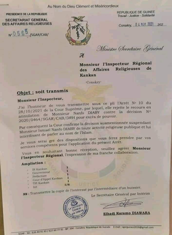 Dans une lettre en date du 04 novembre 2021 dont Laguinee.info détient copie, transmise à l’inspecteur régional des affaires religieuses, le Secrétariat général des affaires religieuses exige l’application de l’arrêt de la cour suprême, rejetant le recours de Ismaël Nanfo contre la décision l’interdisant de parler au nom de l’islam en Guinée.