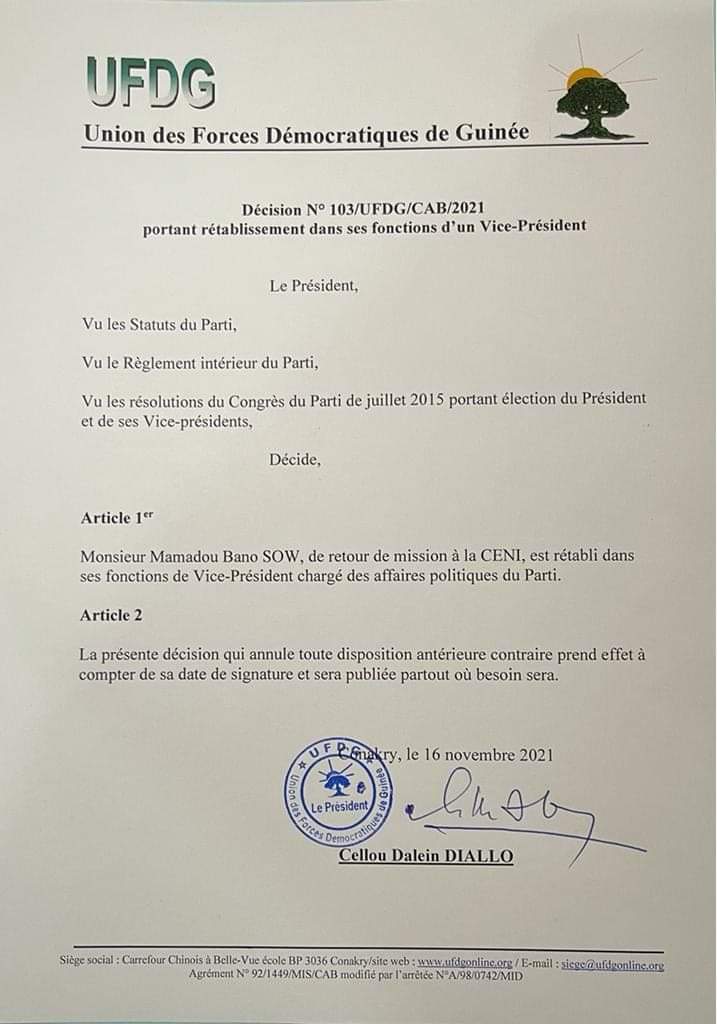 Dans une note en date d’hier mardi 16 novembre 2021 dont Laguinee.info détient copie, l’Union des Forces Démocratiques de Guinée (UFDG) à travers son président a décidé de rétablir Mamadou Bano Sow, de retour en mission à la CENI, de ses fonctions de vice-président chargé des affaires politiques du parti.