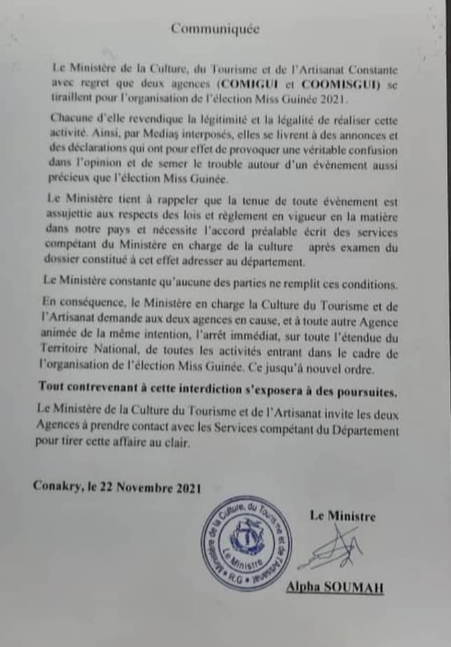 Dans un communiqué en date de ce lundi 22 novembre 2021 dont Laguinee.info détient copie, le Ministère de la Culture, du Tourisme et de l’Artisanat dit constater avec regret que deux agences (COMIGUI, COOMISGUI) se tiraillent pour l’organisation de l’élection Miss Guinée 2021.