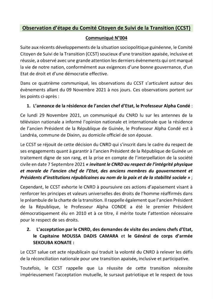 Suite aux derniers développements de la situation socio-politique de la Guinée, le Comité Citoyen de Suivi de la Transition (CCST) qui regroupe en son sein 27 organisations de la société civile a dans un communiqué dont Laguinee.info détient copie, publié son quatrième rapport d’observation et de suivi à mis parcours de la transition en cours en Guinée.