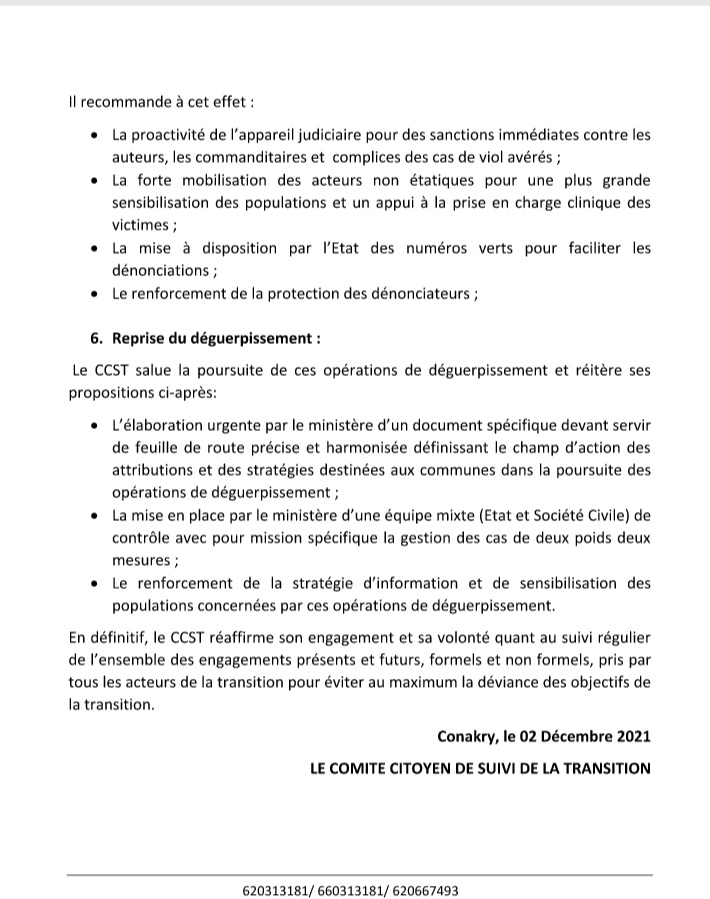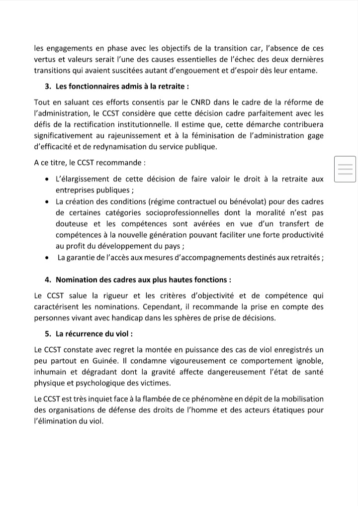 Selon ce communiqué, ces observations du CCST s’articulent autour des événements allant du 09 novembre 2021 à nos jours. Ce sont entre autres, l’annonce de transfèrement de l’ancien président Alpha Condé à Landréah; l’acceptation par le CNRD, des demandes de visite des anciens Chefs d’Etat, le Capitaine Moussa Dadis Camara et le Général Sékouba Conté; le cas des fonctionnaires admis à la retraite; la nomination des cadres aux plus hautes fonctions; la récurrence du viol et la reprise du déguerpissement.