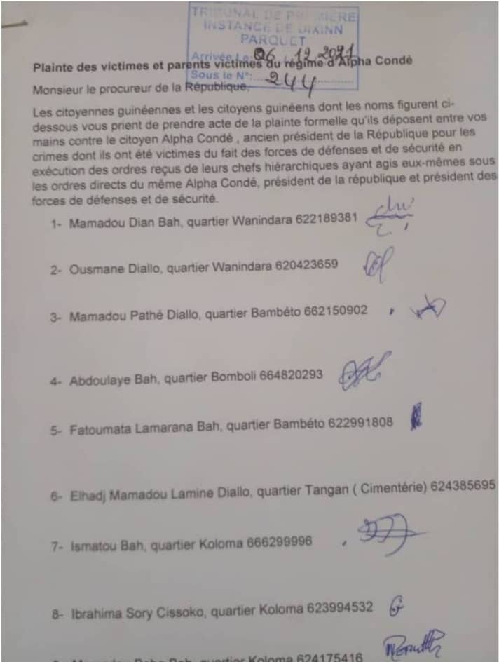 « Les citoyennes guinéennes et les citoyens guinéens dont les noms figurent ci- dessous vous prient de prendre acte de la plainte formelle qu’ils déposent entre vos mains contre le citoyen Alpha Condé, ancien président de la République pour les crimes dont ils ont été victimes du fait des forces de défenses et de sécurité en exécution des ordres reçus de leurs chefs hiérarchiques ayant agi eux-mêmes sous les ordres directs du même Alpha Condé, président de la république et président des forces de défenses et de sécurité », peut-on lire dans cette plainte.