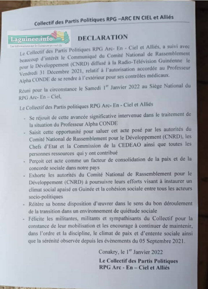 Dans une déclaration rendue publique ce lundi, 03 janvier 2022 dont Laguinee.info détient copie, le RPG arc-en-ciel a salué la décision prise par le CNRD visant à permettre à l’ancien président de la République, professeur Alpha Condé de se rendre à l’extérieur pour ses contrôles médicaux. L’ancien parti salue « cette avancée significative intervenue dans le traitement de la situation du professeur Alpha Condé ».