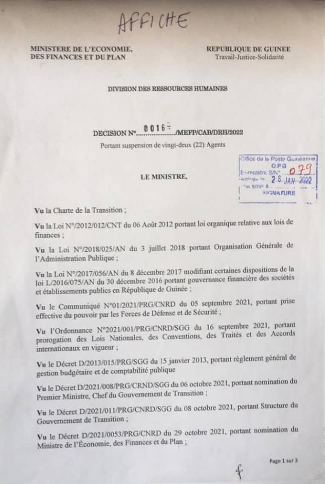 Dans la décision en date du 25 janvier 2022 dont Laguinee.info détient copie, le ministre a suspendu ces agents comptables de leurs fonctions à titre conservatoire jusqu’à la fin des enquêtes.