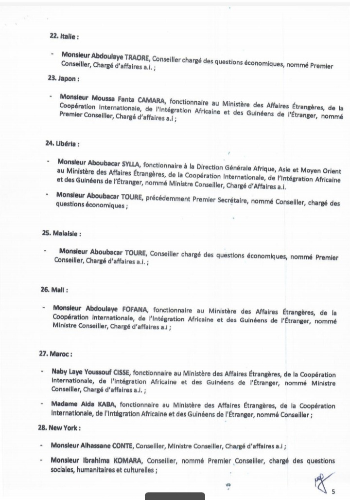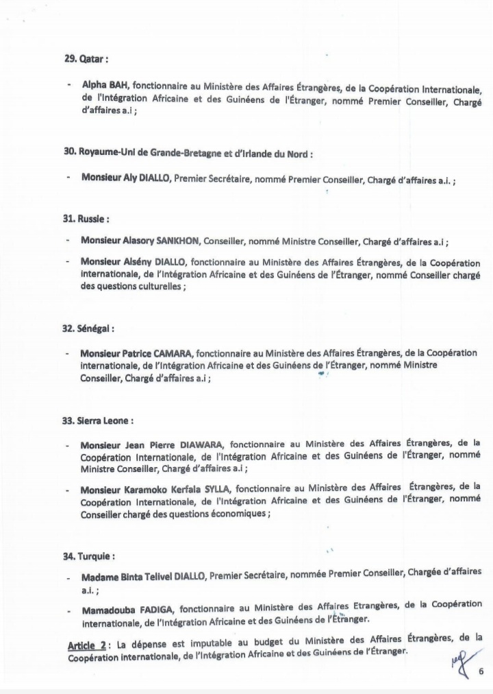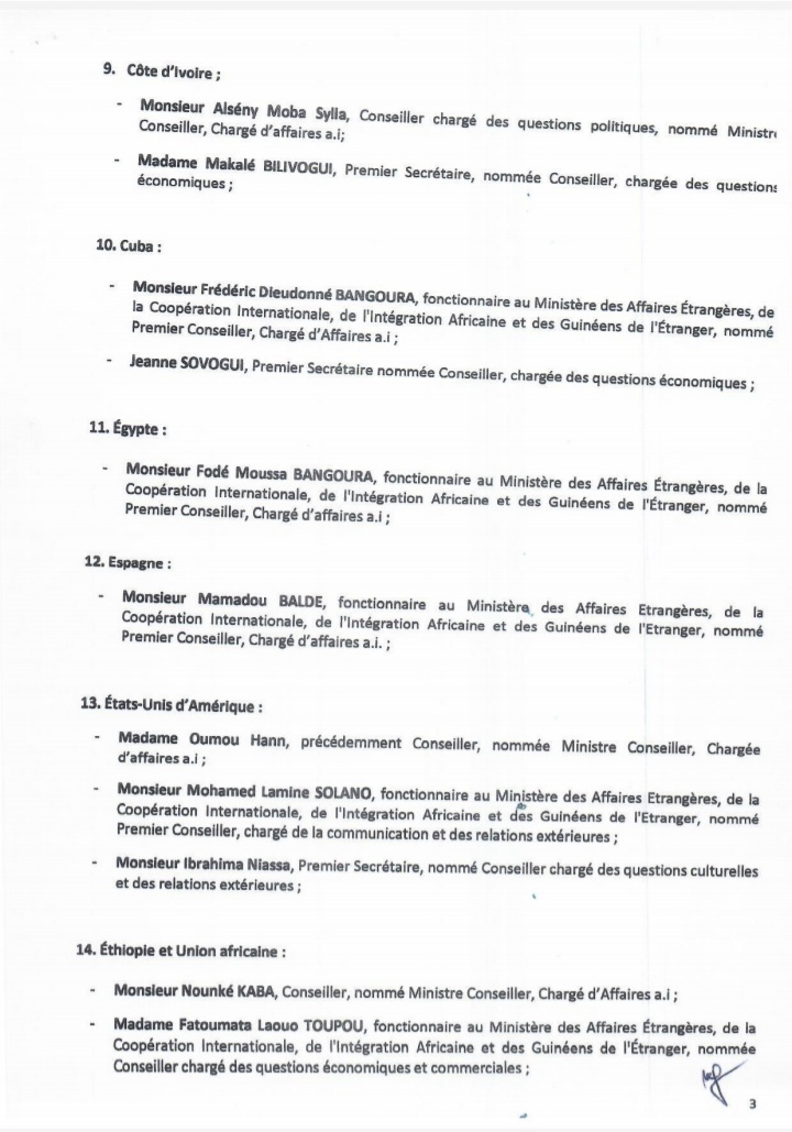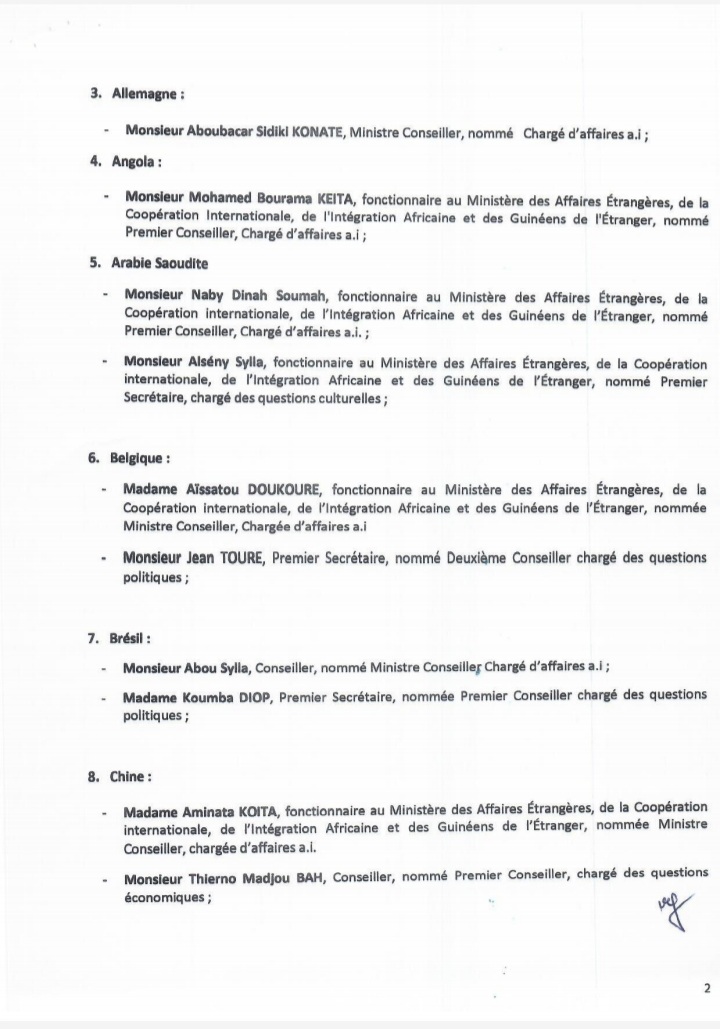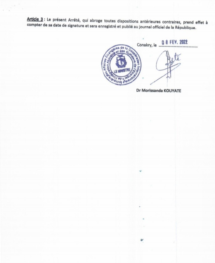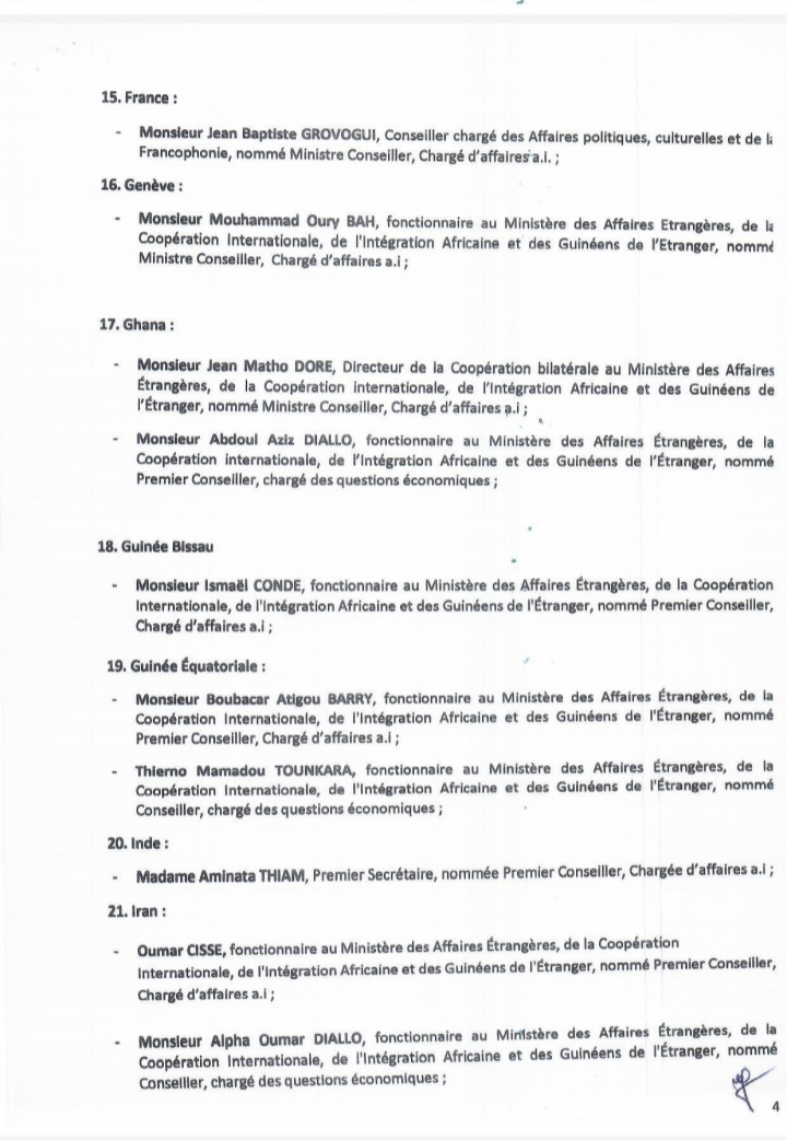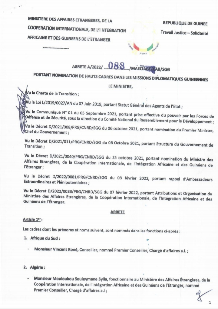 Dans un arrêté lu dans la soirée d’hier mercredi, 08 février 2022 sur les ondes de la Radio Télévision Guinéenne, le ministre des Affaires étrangères, de la Coopération internationale, de l’intégration africaine et des Guinéens de l’étranger a procédé à la nomination des chargés d’affaires, ce après le rappel dernier des ambassadeurs. Ces chargés d’affaires devront assurer le rôle d’ambassadeur par intérim.