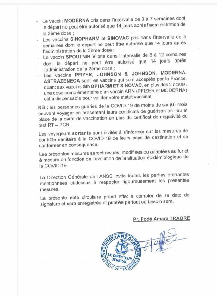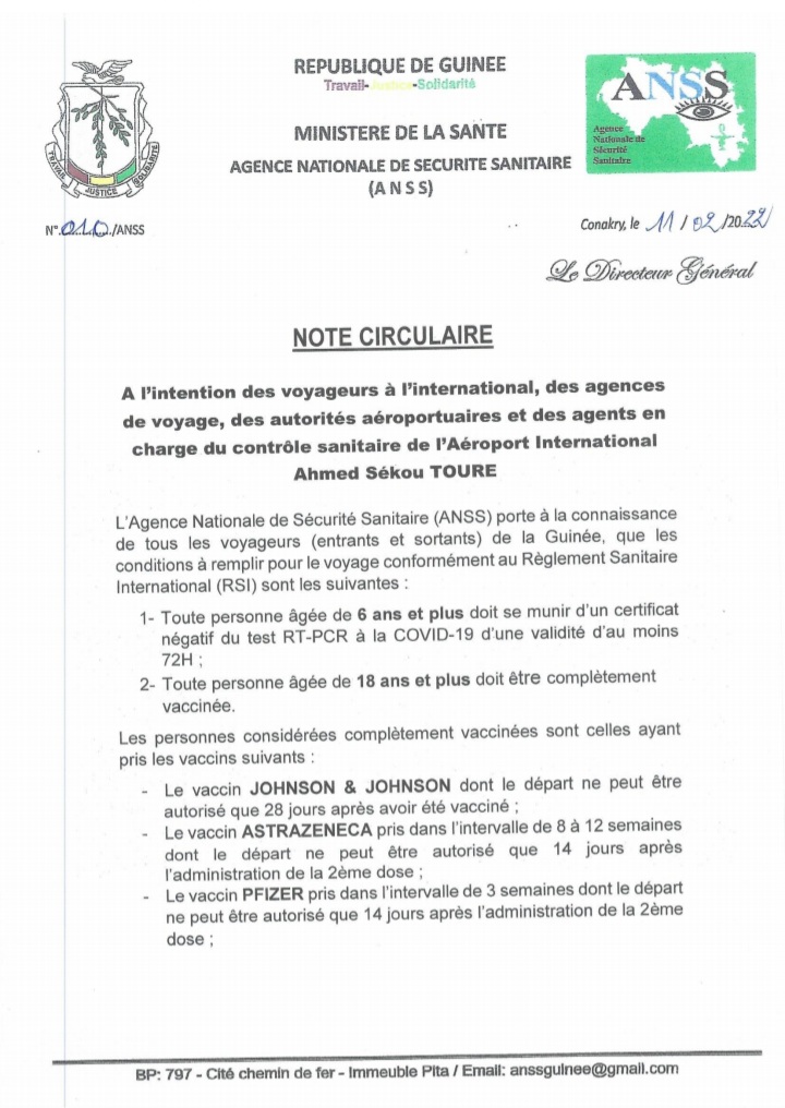 Dans une note circulaire en date d’hier vendredi 11 février 2022 dont Laguinee.info détient copie, l’Agence Nationale de Sécurité Sanitaire (ANSS) dit porter à la connaissance de tous les voyageurs (entrants et sortants) de la Guinée, que les conditions à remplir pour le voyage conformément au Règlement Sanitaire International (RSI) sont les suivantes :