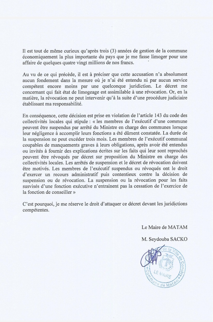 Plus loin, monsieur Seydouba Sacko dit se réserver le droit d’attaquer ce décret de limogeage devant les juridictions compétentes.
