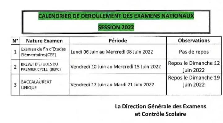 Le calendrier des examens nationaux 2021-2022 est désormais connu. Il a été rendu public ce mercredi, 16 mars 2022. Ces évaluations se dérouleront du 06 au 21 juin prochain, a appris Laguinee.info à travers un de ses reporters.
