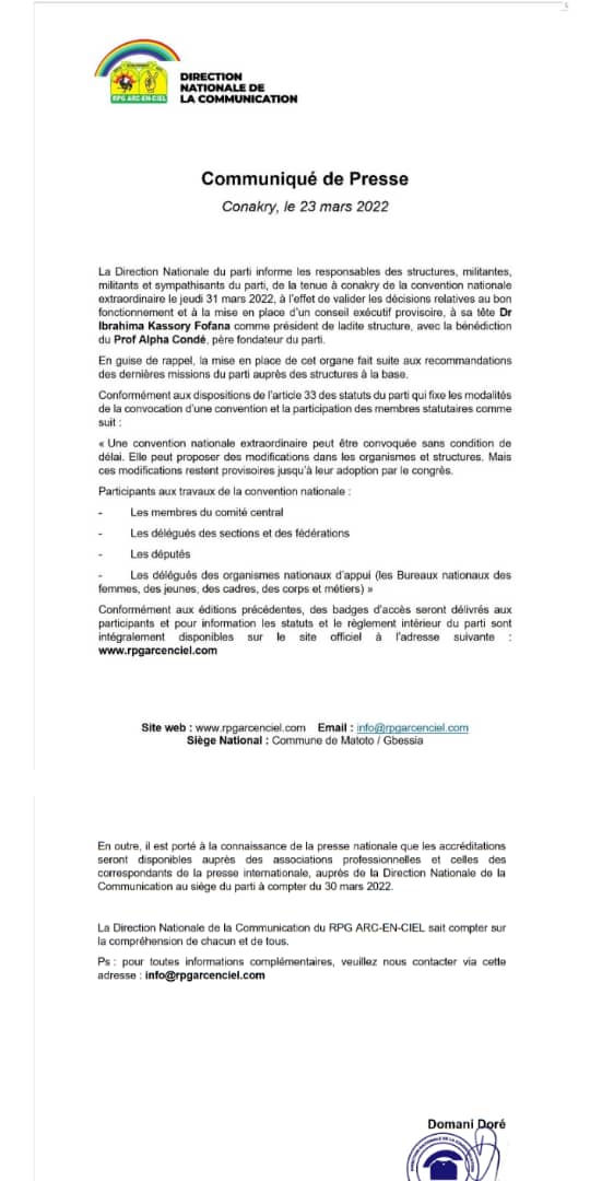 L’ex parti au pouvoir annonce une convention nationale extraordinaire pour le 31 mars 2022. C’est le contenu d’un communiqué signé de Domani Doré de la direction de communication dudit parti dont Laguinee.info détient copie. La convention en vue consistera essentiellement de valider l’organe provisoire déjà mis en place pour présider la formation politique. Ce qui sous-entend que c’est bien parti pour Kassory Fofana de rester à la tête du parti.
