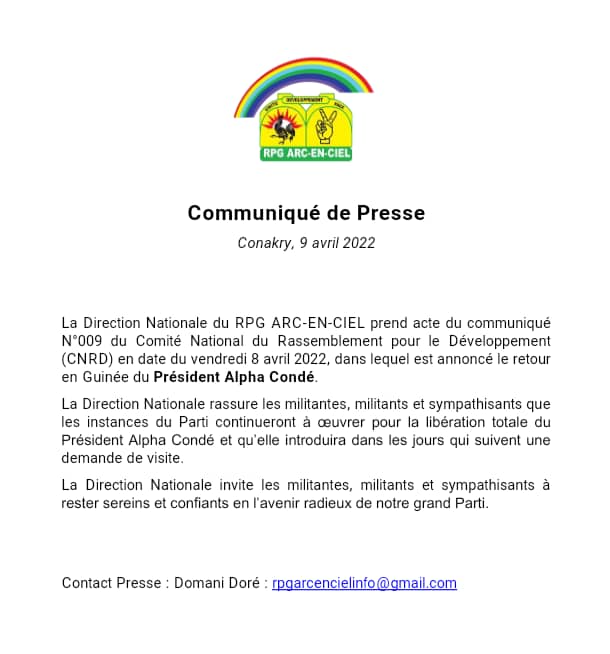Le RPG arc-en-ciel compte rendre visite à Alpha Condé revenu au pays hier vendredi, 08 avril 2022 après un long séjour médical à Abu Dhabi. C’est ce qu’il a fait savoir dans un communiqué publié ce samedi, 09 avril 2022 dont Laguinee.info détient copie. En plus, il réitère son engagement à œuvrer pour la libération totale de l’ancien président guinéen.