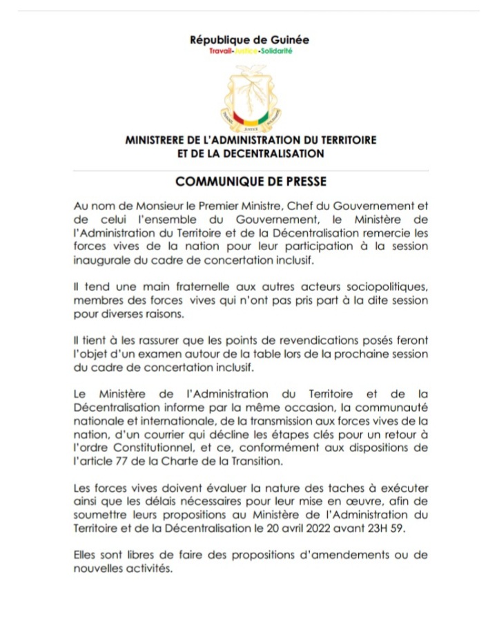 Dans un communiqué lu dans la soirée d’hier lundi, 18 avril 2022 à la RTG, le ministre de l’Administration du territoire et de la décentralisation a, au nom de monsieur le Premier ministre, Chef du Gouvernement et de celui de l’ensemble du Gouvernement, remercié les forces vives de la nation pour leur participation à la session inaugurale du cadre de concertation inclusif.