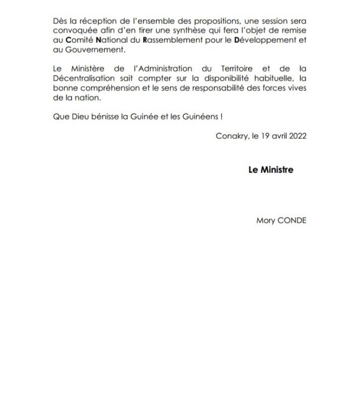 Dans ledit communiqué dont Laguinee.info détient copie, « le ministre Mory Condé tend une main fraternelle aux autres acteurs sociopolitiques membres des forces vives qui n’ont pas pris part à ladite session pour diverses raisons ».