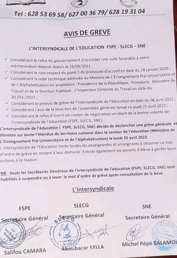Dans un avis de grève en date de ce jeudi, 21 avril 2022 dont Laguinee.info détient copie, l’intersyndicale de l’éducation (FSPE, SLECG, SNE) a décidé de déclencher une grève générale et illimitée sur toute l’étendue du territoire national dans le secteur de l’éducation (Ministère de L’Enseignement Pré-Universitaire et de l’Alphabétisation) le lundi 25 avril 2022.