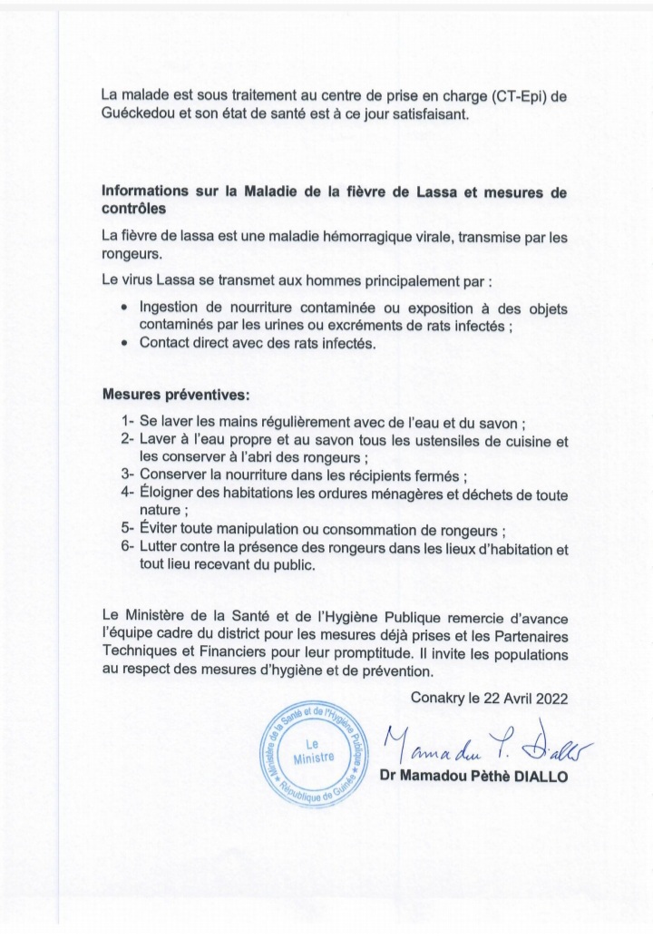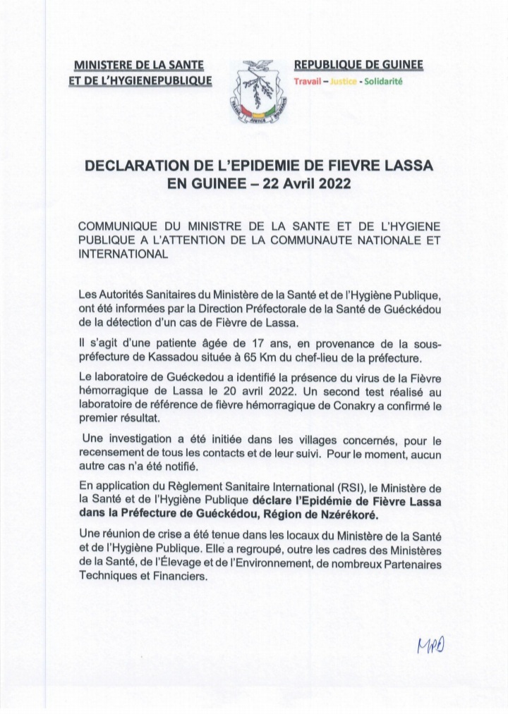 Un premier cas de l’épidémie de fièvre Lassa a été détecté en Guinée, précisément à Gueckedou, une préfecture au sud du pays. Le porteur est un adolescent de 17 ans. Les autorités sanitaires envisagent déjà une investigation pour retrouver ses derniers contacts. C’est ce que laisse voir un communiqué qu’elles ont publié ce vendredi 22 avril 2022 dont Laguinee.info détient copie.